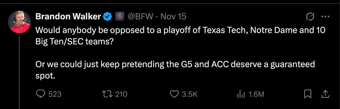 Maybe there’s some sort of 4D chess going on here. Maybe Yormark feels like pushing back too hard right now lessens the chances of the SEC agreeing to a 24-team playoff with four autobids for each of the Power Four conferences, an idea that the Big Ten has proposed.